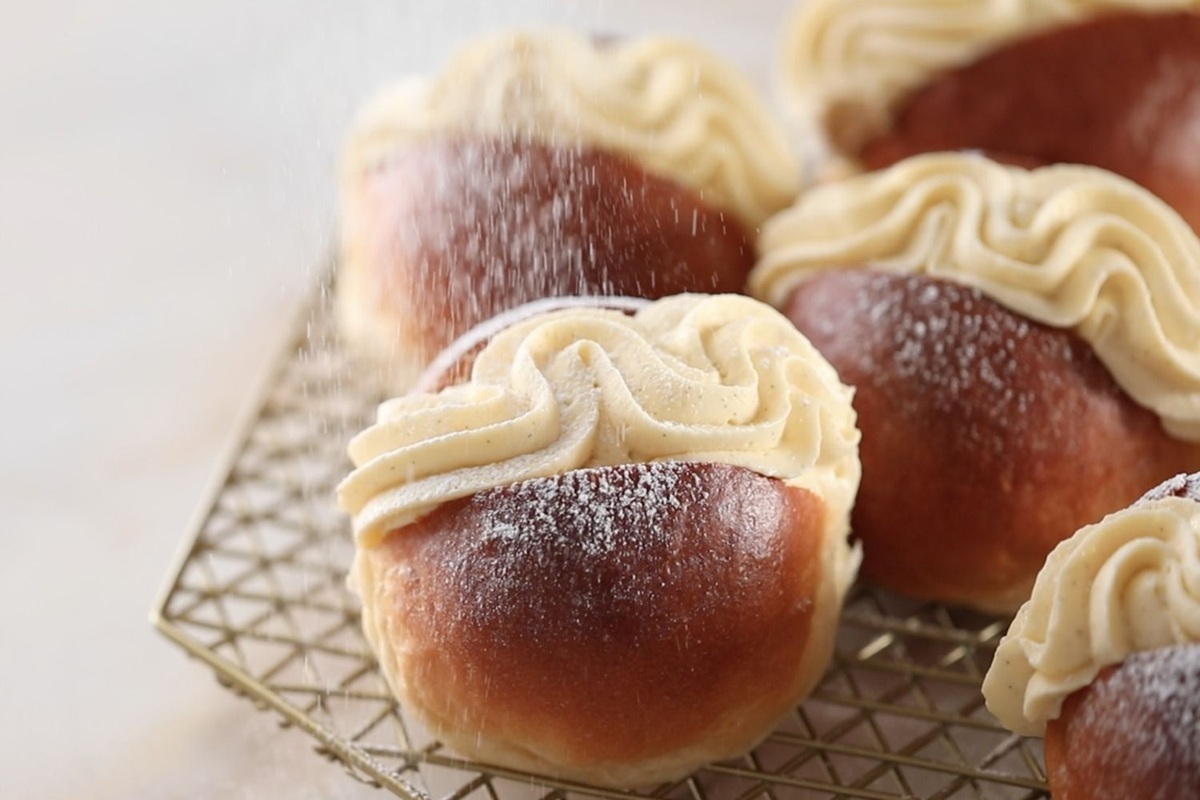 Barre uniformemente a massa com o creme arrefecido, deixando uma margem de cerca de 1 cm nos lados mais compridos. Enrole ao longo do lado mais comprido. Corte-o em pedaços de 8-10 cm de comprimento. Coloque os pãezinhos assim preparados numa assadeira forrada com papel vegetal, deixando bastante espaço entre eles. Cubra com um pano e deixe repousar durante meia hora para continuar a levedar.