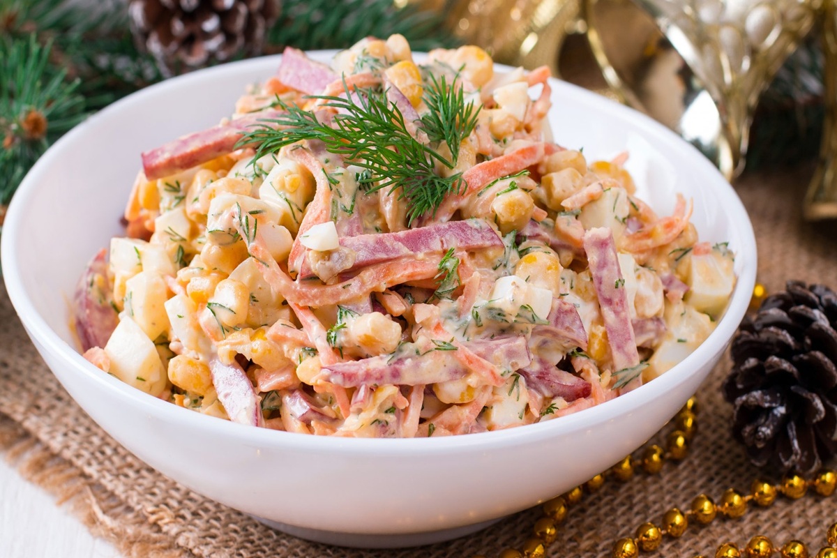 A salada com salsicha é uma proposta clássica e saciante, que é uma variação da tradicional salada de legumes. É ótima como um almoço rápido e nutritivo, mas também como acompanhamento para o pequeno-almoço ou jantar. Os ovos e as batatas dão energia para o dia todo, e o pepino fresco confere uma textura crocante. Os ervilhas, por sua vez, introduzem uma nota doce interessante. Pode servir esta salada também no Natal ou na Páscoa. Fica mais saborosa no dia seguinte após a preparação.