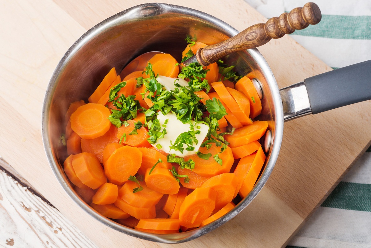 Por outro lado, a vitamina C e parte das vitaminas B realmente não toleram bem altas temperaturas, por isso não vale a pena cozinhar os vegetais por muito tempo. A melhor solução? Um cozimento rápido – al dente, para que a cenoura fique macia, mas ainda ligeiramente firme.