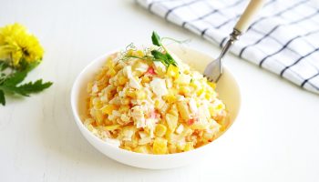 Pico finamente os palitos de caranguejo e coloco um ovo numa tigela. Uma salada deliciosa para levar para o trabalho ou para uma festa