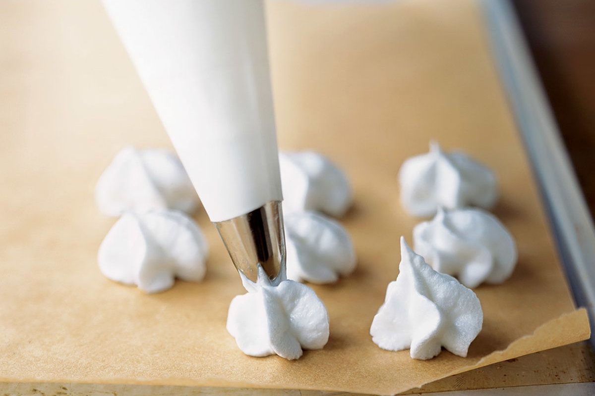 Leve ao forno e asse por 10 minutos, depois reduza a temperatura para 120 °C, depois reduza a temperatura para 100 °C e asse por mais 2 horas. Após esse tempo, deixe o merengue no forno com a porta entreaberta até esfriar completamente.