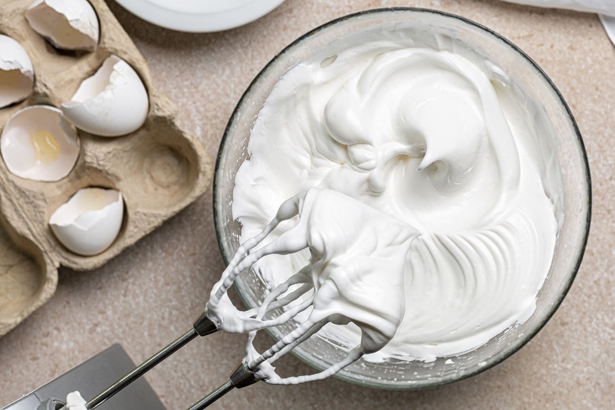 Bata as claras com uma pitada de sal até ficarem em neve. Em seguida, adicione uma colher de sopa de açúcar, batendo continuamente até a merengue ficar espessa e brilhante. No final, adicione o sumo de limão e a farinha de batata, mexendo delicadamente com uma espátula.