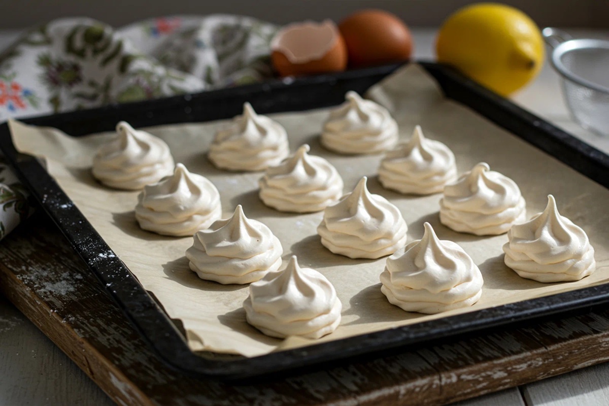 Bata as claras com uma pitada de sal até ficarem em neve. Em seguida, adicione uma colher de sopa de açúcar, batendo continuamente até a merengue ficar espessa e brilhante. No final, adicione o sumo de limão e a farinha de batata, mexendo delicadamente com uma espátula.